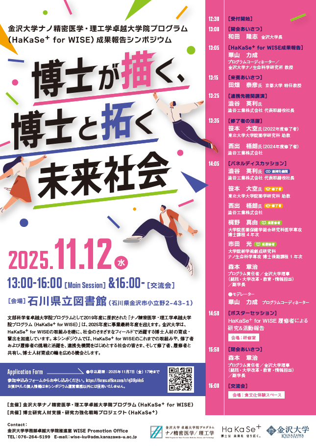 Building on the achievements of HaKaSe+ for WISE, Kanazawa University continues to foster and promote doctoral talents who contribute to diverse fields across society. This symposium will provide an opportunity for the programme’s initiatives, as well as the challenges and accomplishments of its selected students, to be shared with partner institutions, stakeholders, graduates and current students, thereby expanding the network for the development of doctoral talent.